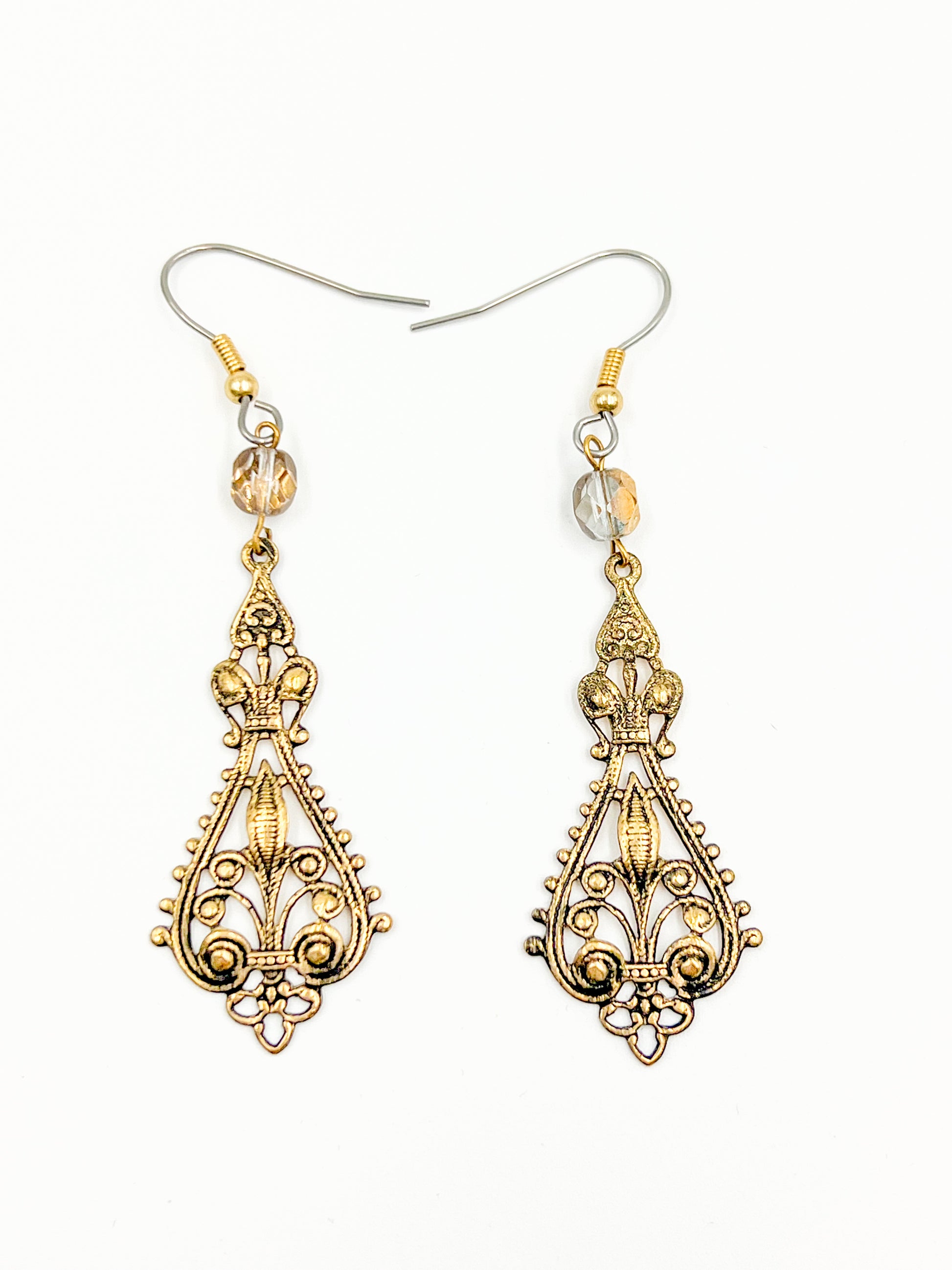 This drop-style Filigree Fleur De Lis earrings comes elegant brassy gold tones. They feature sterling silver wire backs for a secure and comfortable fit.