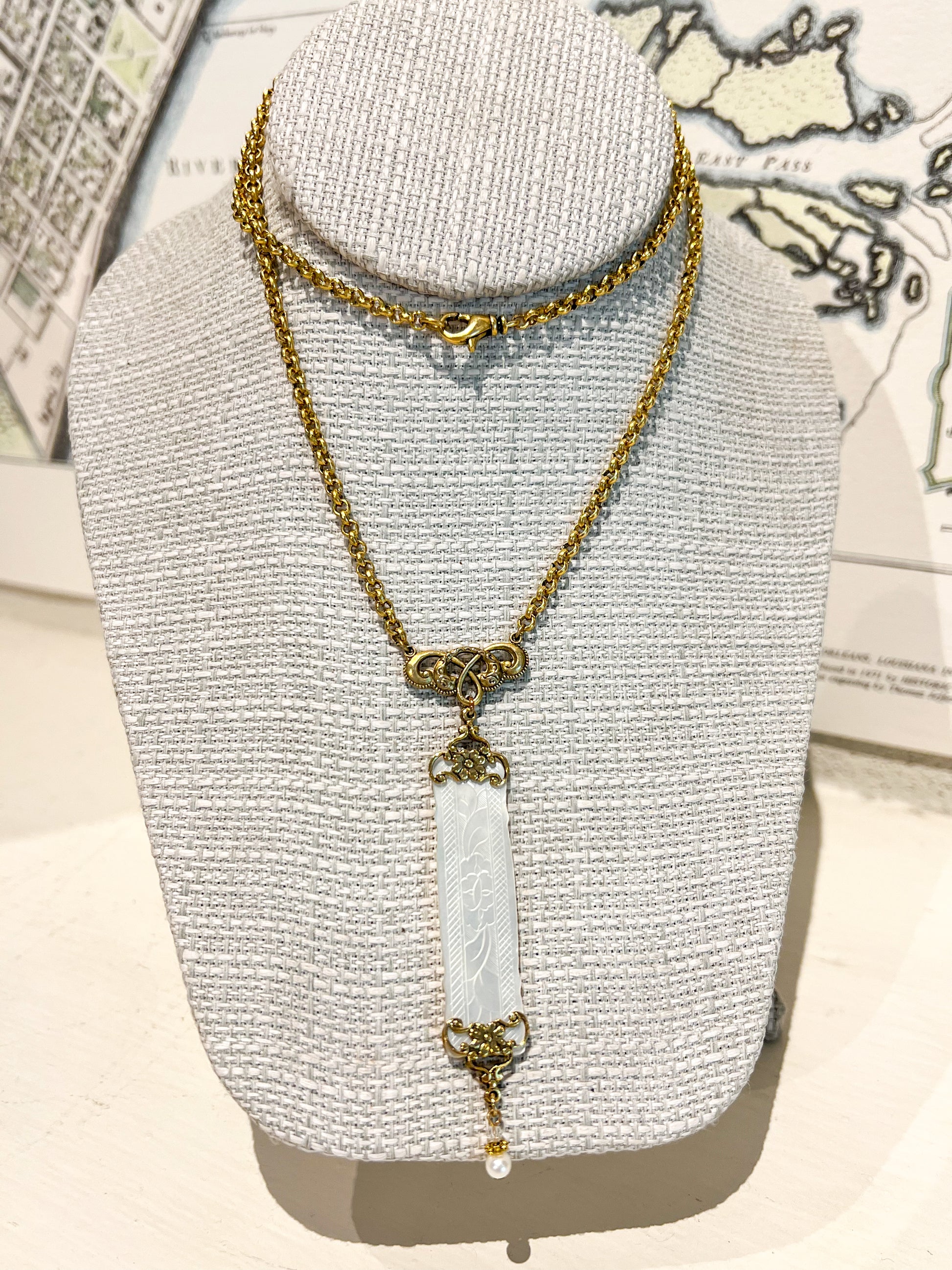 This exquisite Mother of Pearl necklace features a finely crafted rectangle pendant with a delicate flower etched into its surface, showcasing the artistry of Qing Dynasty artisans from 1736 to 1840. The pendant is mounted on a 20-inch chain with gold-plated brass findings, sourced from a New England foundry with a rich heritage dating back to the 1800s. Combining historical elegance with timeless beauty, this piece offers a subtle yet sophisticated statement, perfect for those who appreciate intricate craftsmanship and cultural legacy in their jewelry collection.