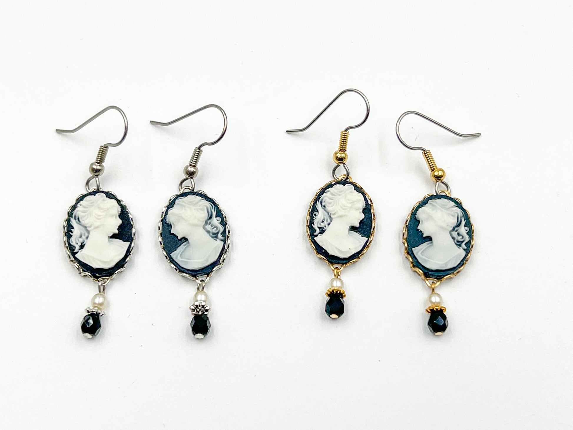 The Black Cameo Earrings set in a refined gold or silver setting showcase an elegant contrast that highlights their classic beauty. Each earring features a detailed black cameo design, framed by warm gold tones, creating a timeless accessory perfect for both formal occasions and everyday sophistication. The sterling silver wire back ensures a secure and comfortable fit while adding a subtle touch of durability. These earrings are an exquisite choice for those who appreciate vintage-inspired elegance combined with modern craftsmanship.