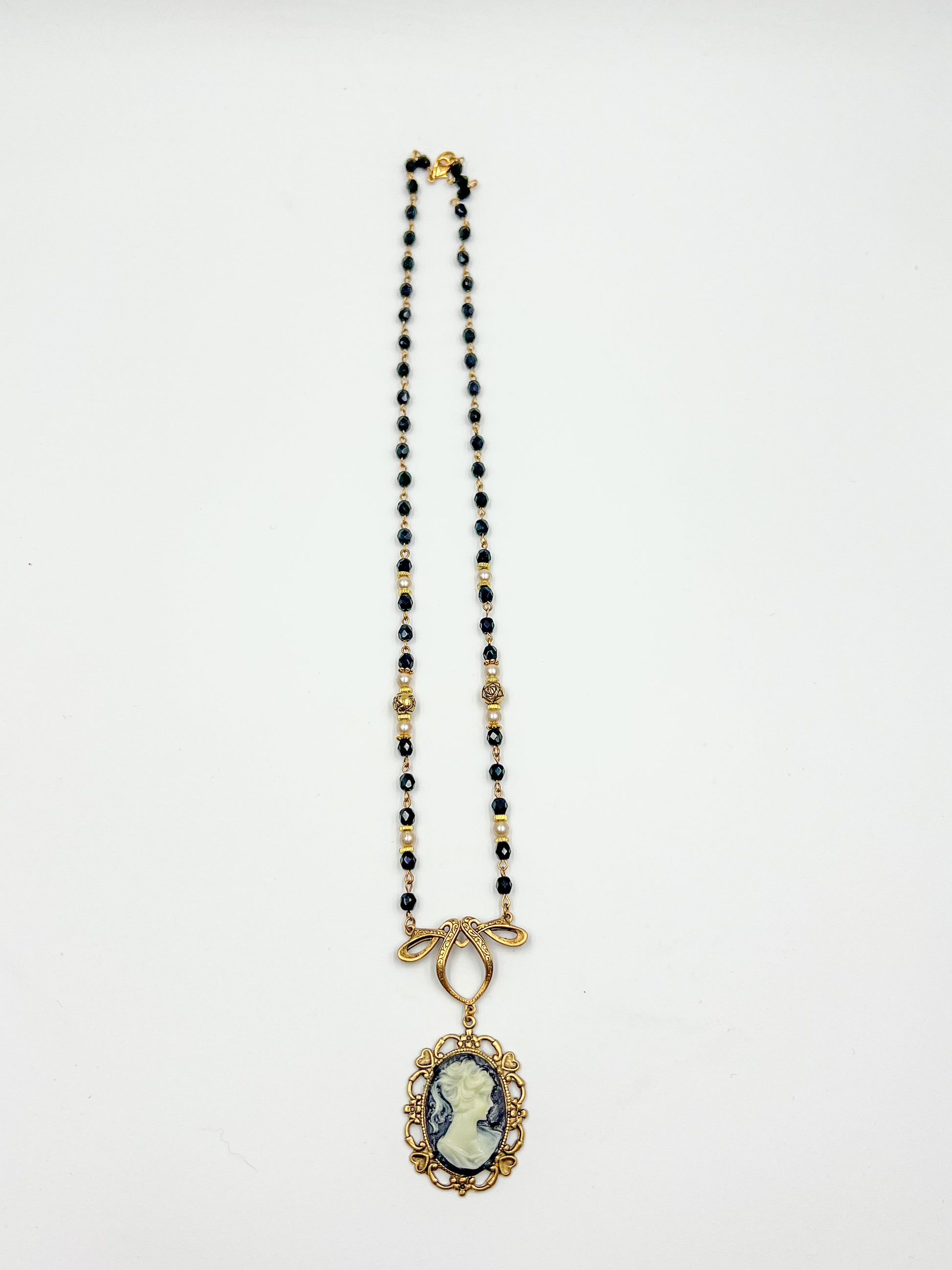 This elegant medium cameo necklace captures the refined aesthetics of the Victorian era. Featuring a striking black cameo centerpiece, the design showcases authentic gold-plated brass components and chain sourced from a historic New England foundry with roots dating back to the 1800s. Complementing the vintage-inspired setting are lustrous fire-polished Czech glass beads and pearl accents that add timeless sophistication. A distinguished piece for those who appreciate classical jewelry craftsmanship and historical detail.