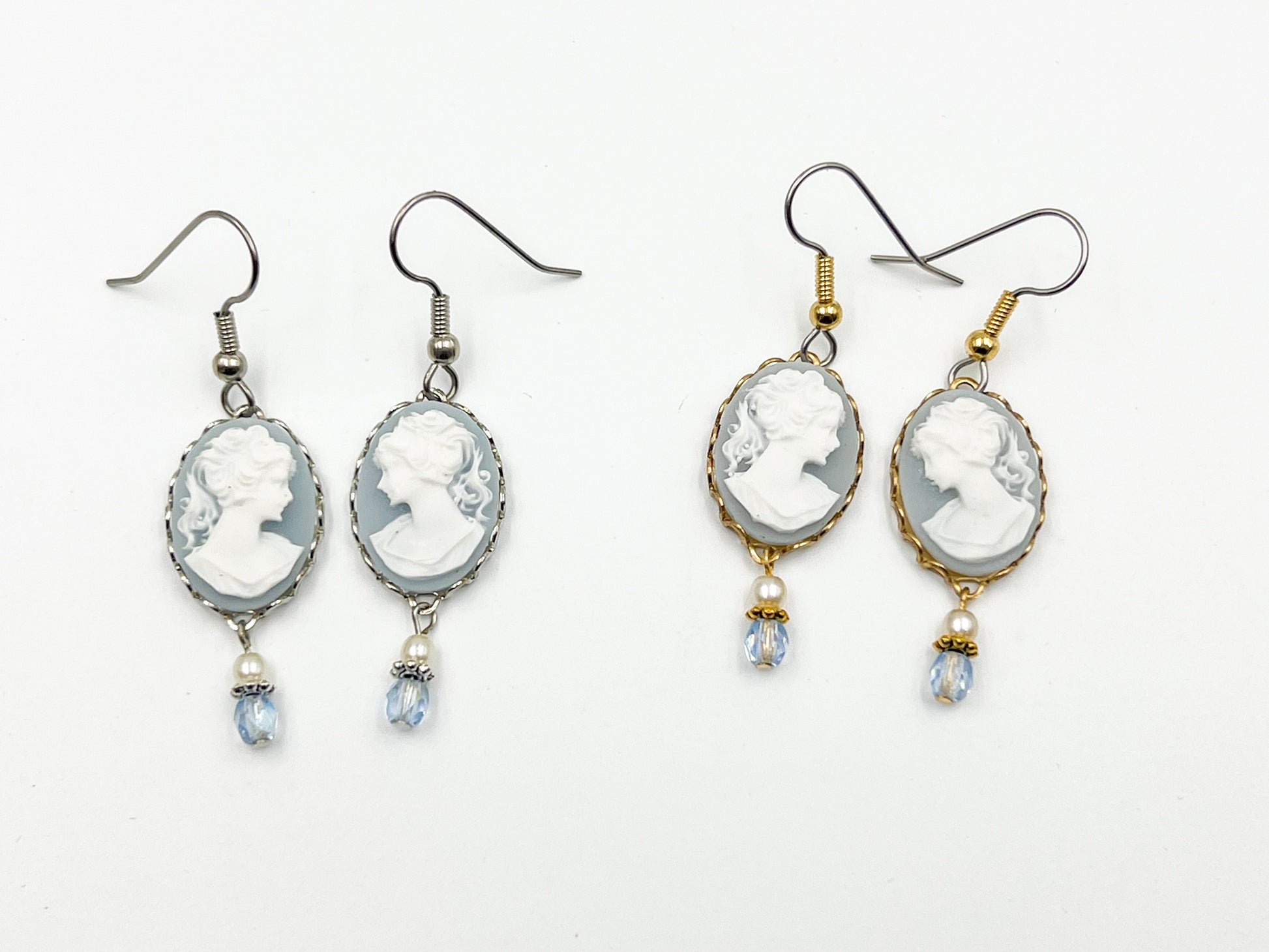 Elegant and timeless, these Blue Cameo Earrings in a refined silver or gold setting showcase exquisite craftsmanship. The delicate sterling silver wire backs ensure a secure, comfortable fit while highlighting the intricate blue cameo design. Perfect for enhancing both formal and everyday ensembles, these earrings offer a subtle touch of sophistication and classic beauty. Their enduring style makes them a cherished addition to any jewelry collection.