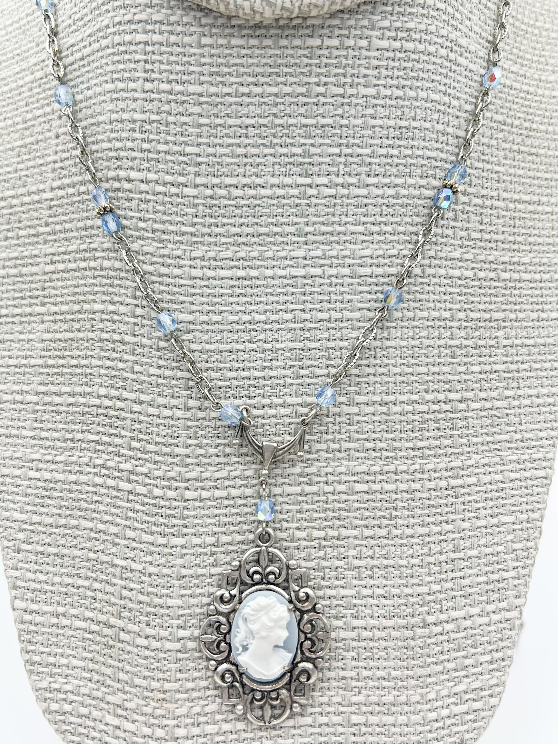 This charming necklace features a resin cameo in a lovely blue hue, nestled in a silver-plated setting crafted by a New England foundry that's been creating authentic Victorian designs since the 1800s. Sparkling fire-polished Czech glass beads dance along repurposed chain, creating a delightful piece that bridges past and present with whimsical elegance.