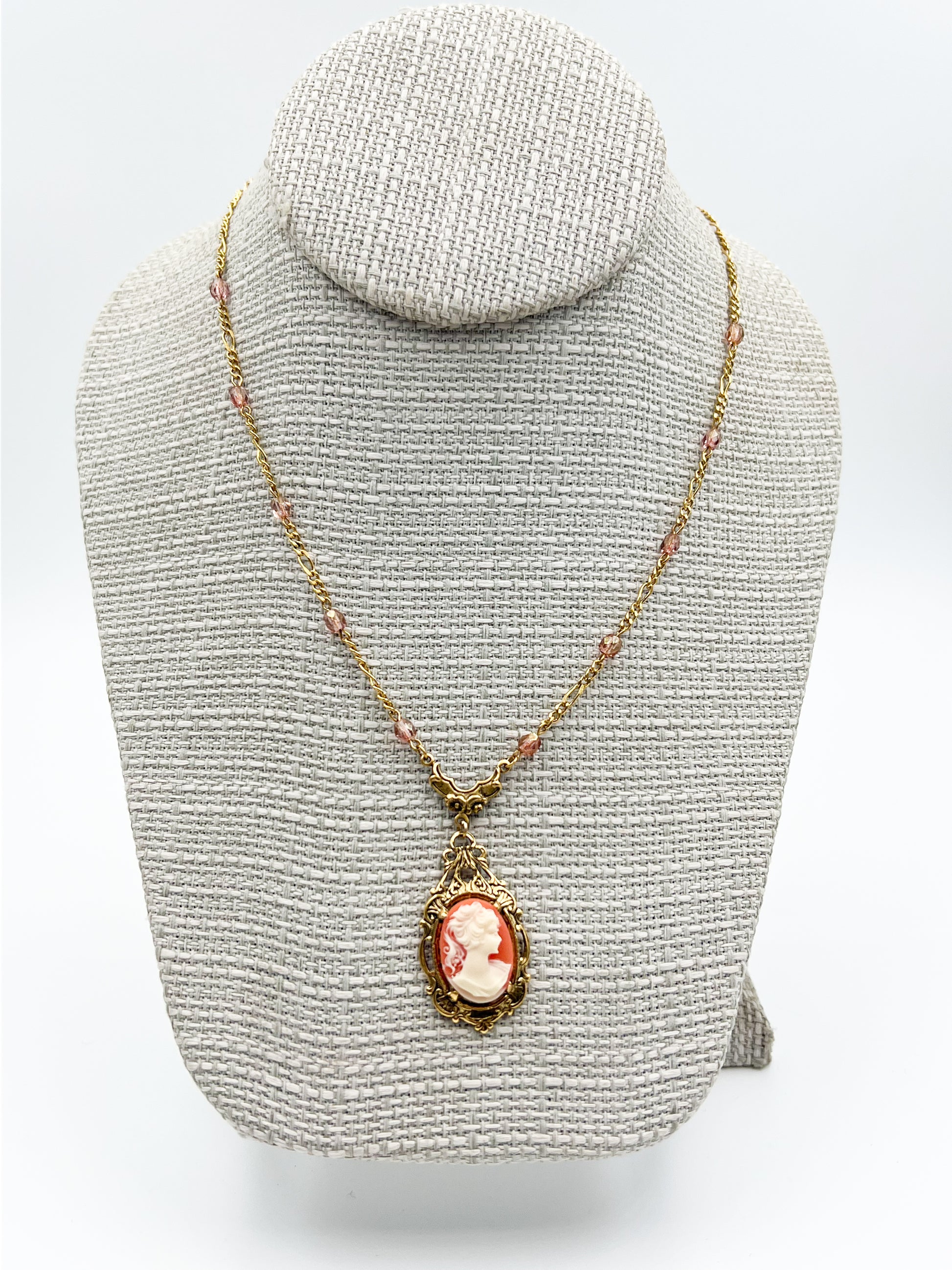 This elegant necklace captures the refined aesthetics of the Victorian era with a striking dark pink cameo set in lustrous gold-plated brass. Handcrafted by a storied New England foundry with roots stretching back to the late 1800s, each piece reflects generations of metalworking expertise. The design is complemented by fire-polished Czech glass beads that catch the light beautifully, adding depth and dimension to this timeless accessory.