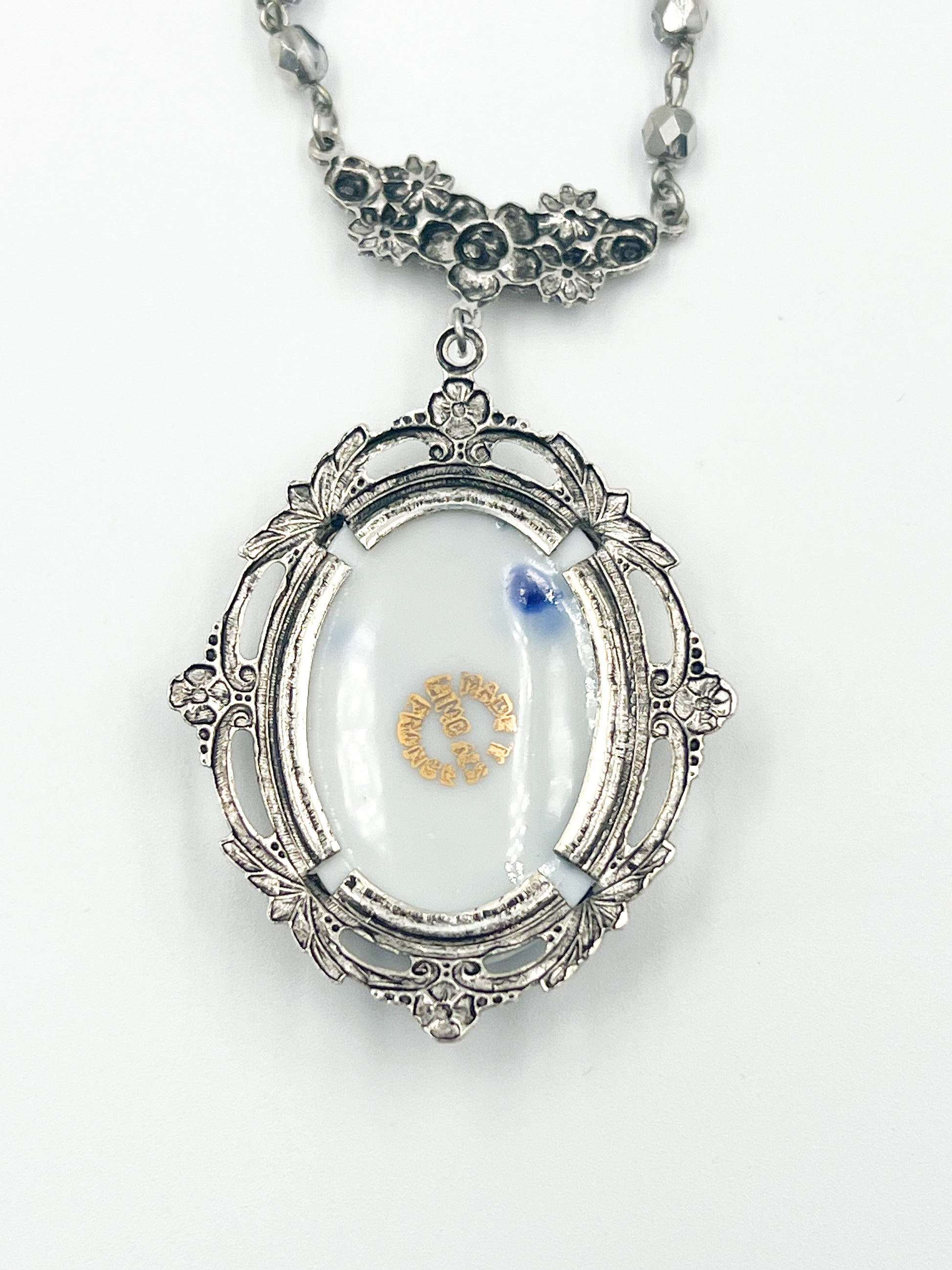 Elevate your style with this delightful necklace featuring exquisite hand-painted porcelain imported from Limoges, France. Suspended in gleaming silver plated settings crafted by a storied New England foundry with roots stretching back to the 1800s, it's adorned with shimmering cultured pearls and crystals. A playful marriage of French artistry and American heritage that's sure to spark conversation.